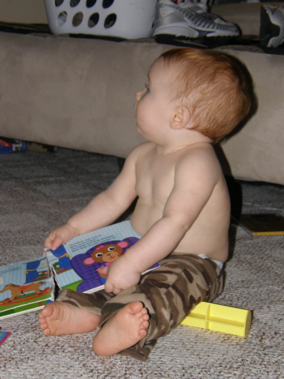 Thatcher loves books... but he can be kind of rough on them. Notice the state of the book in this picture... 5 seconds later it lost its battle to hang on and is offically in two pieces.