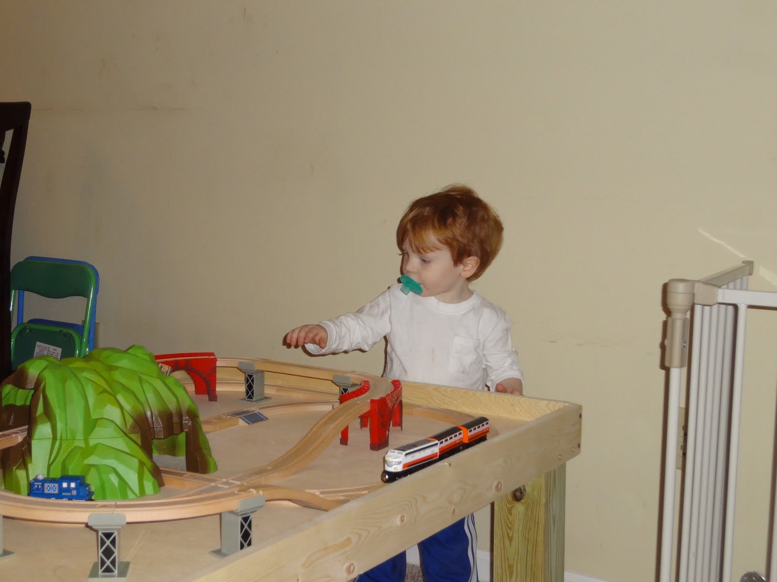 Finally playing with his train set that Santa gave him on his brand new train table that daddy built today!