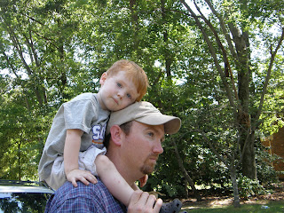 Thatcher taking a ride with Daddy while he cut the grass on the new riding lawn mower. Ear protection was the only way he would get near the thing!